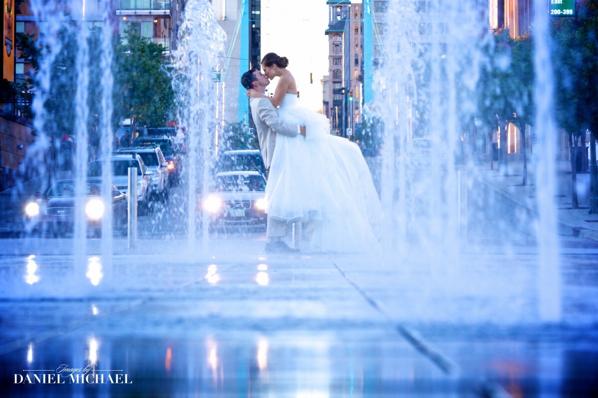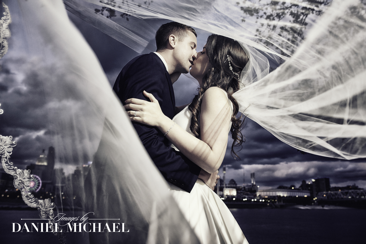 Moody Dramatic Wedding Photography with Classic Pose at sunset with water reflection