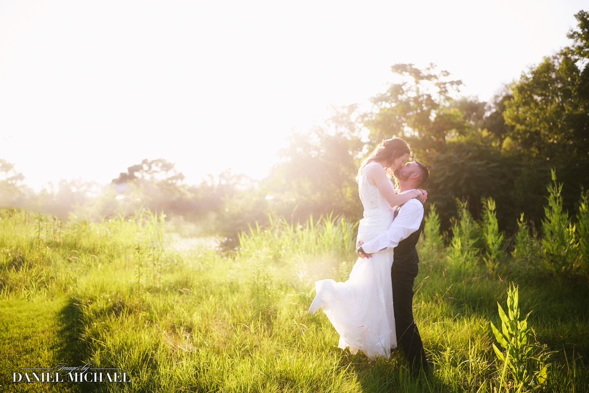 Light and Airy Wedding Photography of Groom Picking up Bride in field